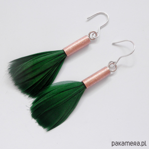 PIÓRKO - stylowy dodatek. Połączenie lekkości piórka i trwałości metalu. Metal niezwykle kontrastuje z naturalnym barwionym puchem. Kolczyki wykonane są z : miedź, naturalne barwione pióra. Miedź : zmatowiona. Bigle otwarte - srebro pr.925. Długość z biglami - 8 cm. Waga: ok. 3 g