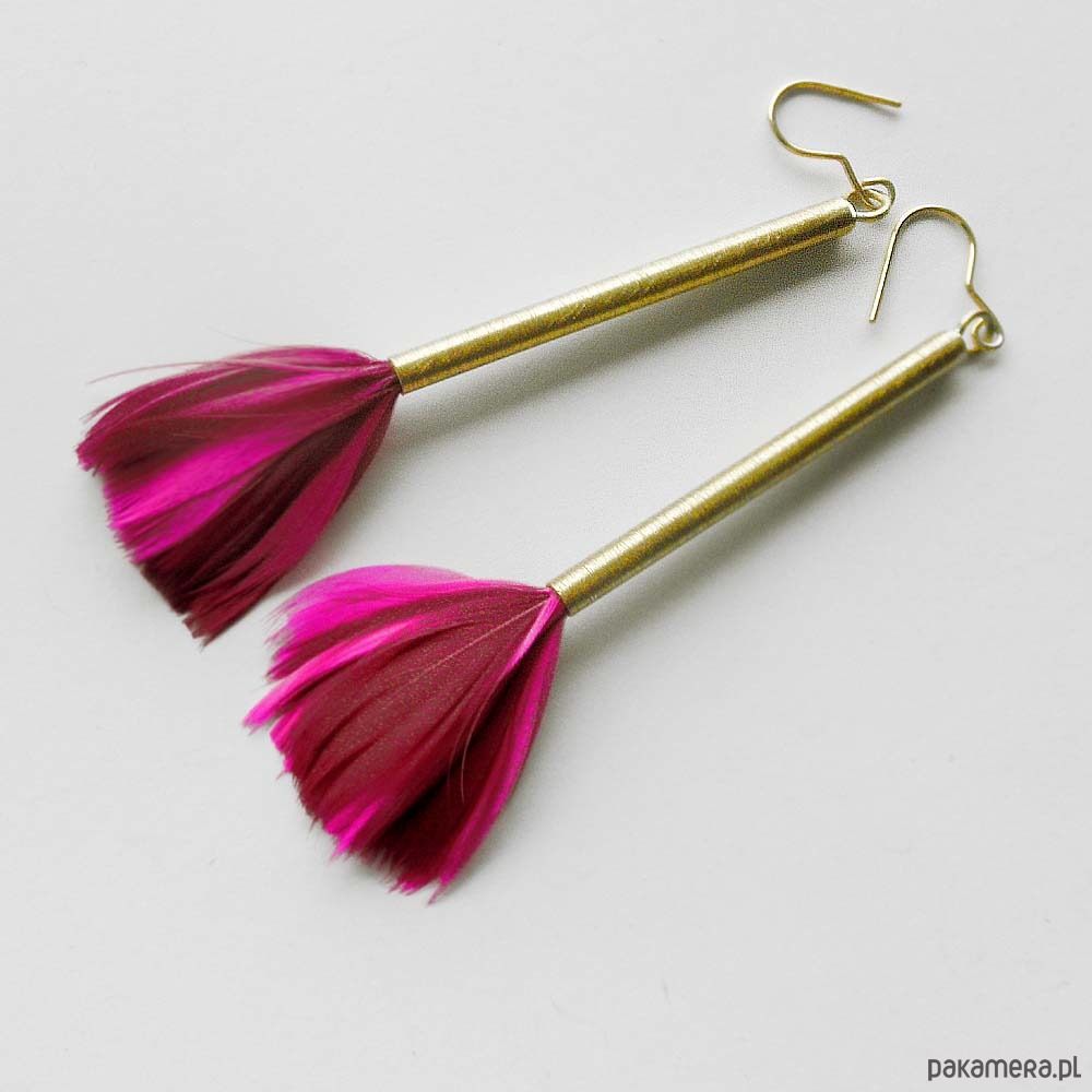 PIÓRKO - stylowy dodatek. Połączenie lekkości piórka i trwałości metalu. Metal niezwykle kontrastuje z naturalnym barwionym puchem. Kolczyki wykonane są z mosiądzu, naturalnie barwione pióra. Mosiądz - zmatowiony. Bigle otwarte - srebro pr.925, pozłacane. Długość z biglami - ok. 10 cm. Szerokość - 2 cm.