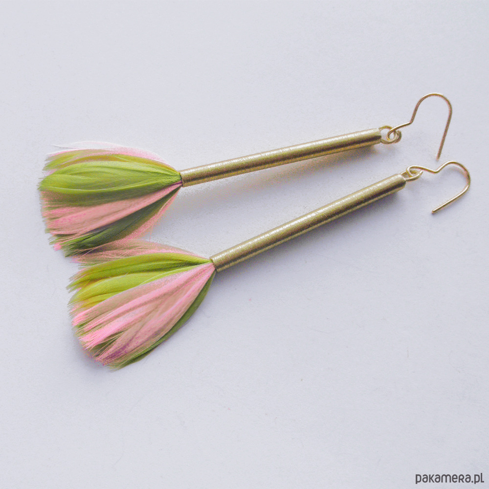 PIÓRKO - stylowy dodatek. Połączenie lekkości piórka i trwałości metalu. Metal niezwykle kontrastuje z naturalnym barwionym puchem. Kolczyki wykonane są z mosiądzu, naturalnie barwione pióra. Mosiądz - zmatowiony. Bigle otwarte - srebro pr.925, pozłacane. Długość z biglami - ok. 10 cm. Szerokość - 2 cm.