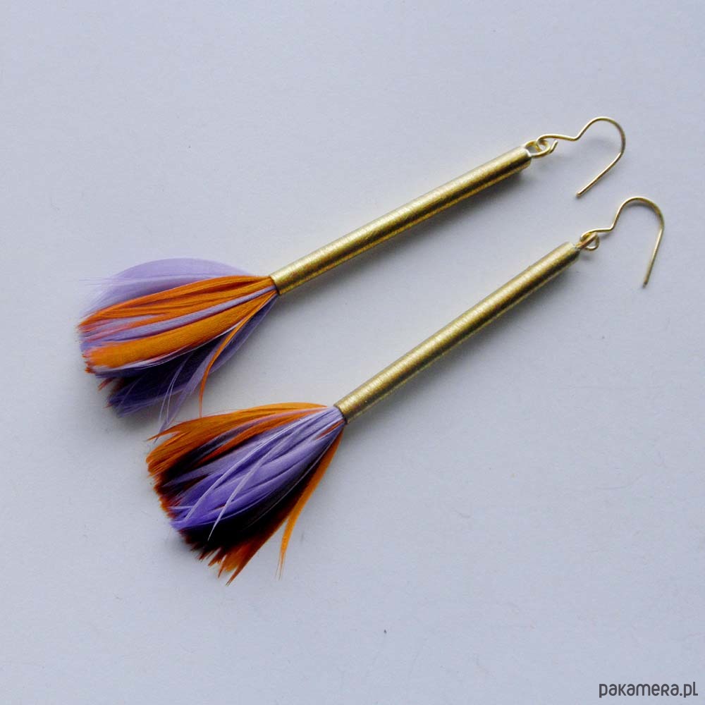 PIÓRKO - stylowy dodatek. Połączenie lekkości piórka i trwałości metalu. Metal niezwykle kontrastuje z naturalnym barwionym puchem. Kolczyki wykonane są z mosiądzu, naturalnie barwione pióra. Mosiądz - zmatowiony. Bigle otwarte - srebro pr.925, pozłacane. Długość z biglami - ok. 10 cm. Szerokość - 2 cm.