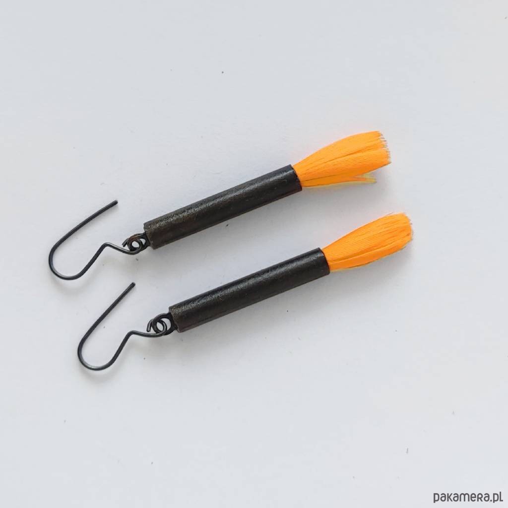PIÓRKO - stylowy dodatek. Połączenie lekkości piórka i trwałości metalu. Metal niezwykle kontrastuje z naturalnym barwionym   puchem.   Kolczyki wykonane są z mosiądz, naturalnie barwione pióra. Mosiądz -  zmatowiony, oksydowane, przecierane. Bigle otwarte - srebro   pr.925 oksydowane. Długość z biglami - 5 cm.