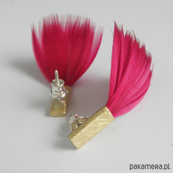 PIÓRKO - stylowy  dodatek. Połączenie  lekkości piórka i  trwałości metalu.  Metal niezwykle  kontrastuje z  naturalnym barwionym  puchem.Kolczyki na  sztyftach. Kolczyki  wykonane są z  :mosiądz,srebro-  próby 0,925,  naturalnie barwione  pióra. Mosiądz -  zmatowiony. Długość  - ok. 3,5cm.  Szerokość - 2 cm.  Waga - ok. 2 g.