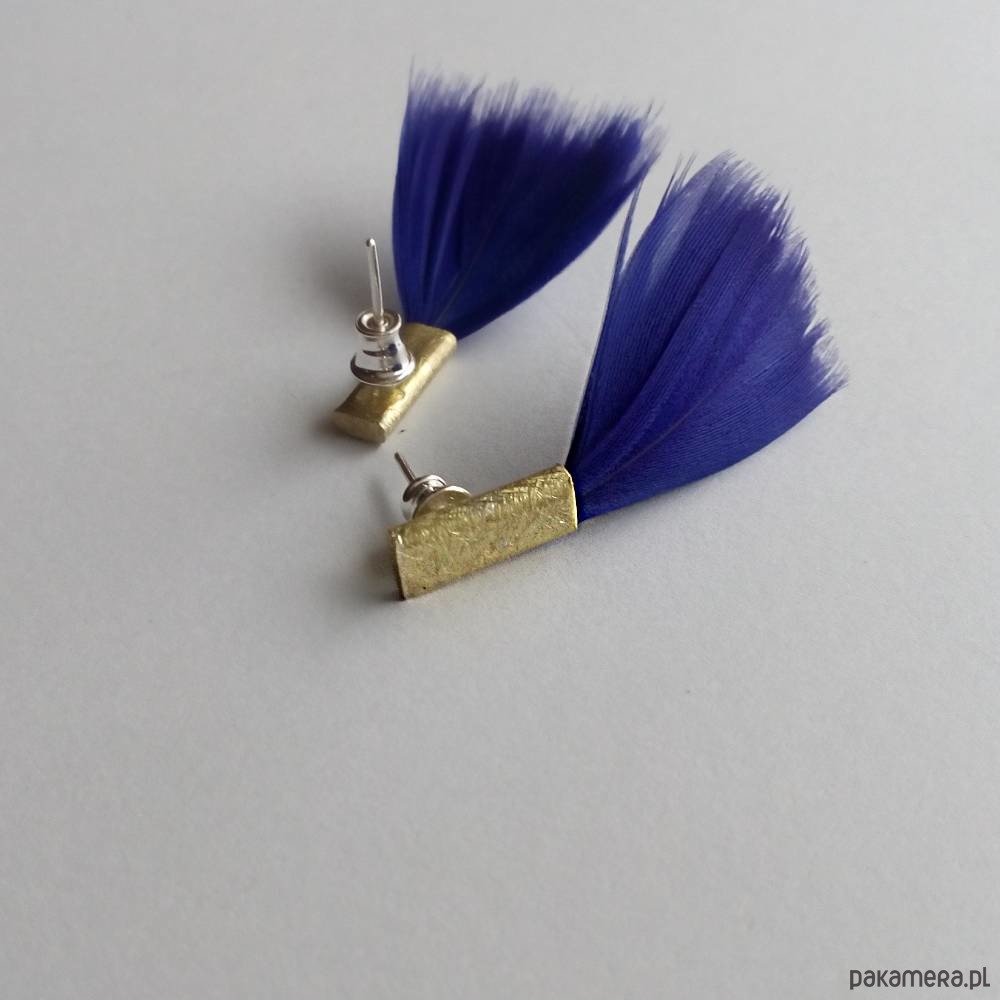 PIÓRKO - stylowy  dodatek. Połączenie  lekkości piórka i  trwałości metalu.  Metal niezwykle  kontrastuje z  naturalnym barwionym  puchem.Kolczyki na  sztyftach. Kolczyki  wykonane są z  :mosiądz,srebro-  próby 0,925,  naturalnie barwione  pióra. Mosiądz -  zmatowiony. Długość  - ok. 3,5cm.  Szerokość - 2 cm.  Waga - ok. 2 g.