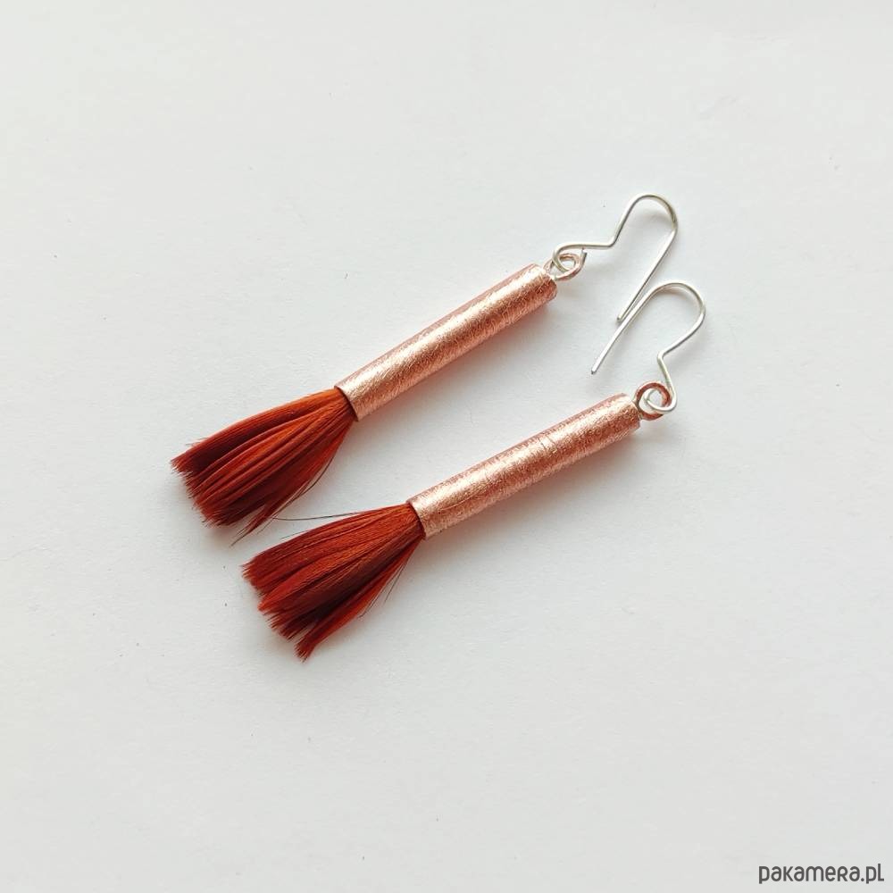 PIÓRKO - stylowy dodatek. Połączenie lekkości piórka i trwałości metalu. Metal niezwykle kontrastuje z naturalnym barwionym puchem. Kolczyki wykonane są z miedzi, naturalnie barwione pióra. Miedź - zmatowiony. Bigle otwarte - srebro pr.925. Długość z biglami - 5 cm.