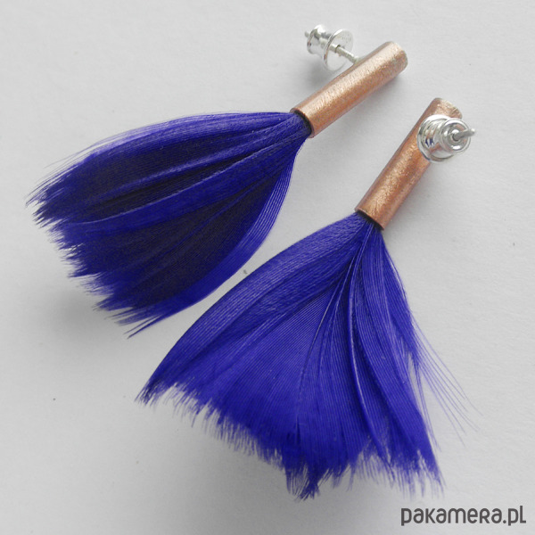 PIÓRKO - stylowy dodatek. Połączenie lekkości piórka i trwałości metalu. Metal niezwykle kontrastuje z naturalnym barwionym puchem.Kolczyki na sztyftach. Kolczyki wykonane są z :miedź,srebro- próby 0,925, naturalnie barwione pióra. Miedź - zmatowiona. Długość - ok. 5cm.