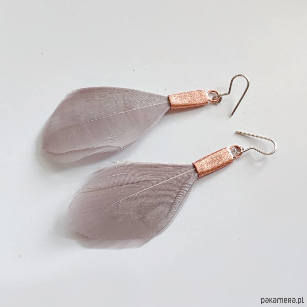 PIÓRKO - stylowy dodatek. Połączenie lekkości piórka i trwałości metalu. Metal niezwykle kontrastuje z naturalnym barwionym puchem. Kolczyki wykonane są z miedzi, naturalnie barwione pióra. Miedź - zmatowiony. Bigle otwarte - srebro pr.925. Długość z biglami - 8 cm. Szerokość ok. 4 cm
