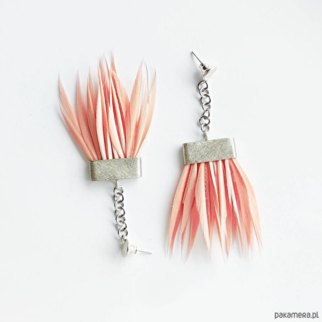 PIÓRKO - stylowy dodatek. Połączenie lekkości piórka i trwałości metalu. Metal niezwykle kontrastuje z naturalnym barwionym puchem. Kolczyki na sztyftach wykonane są z alpaki, srebro ( pr.925), naturalnie barwione pióra. Alpaka - zmatowiona. Długość z ok.9 cm. Szerokość - 5,5 cm.