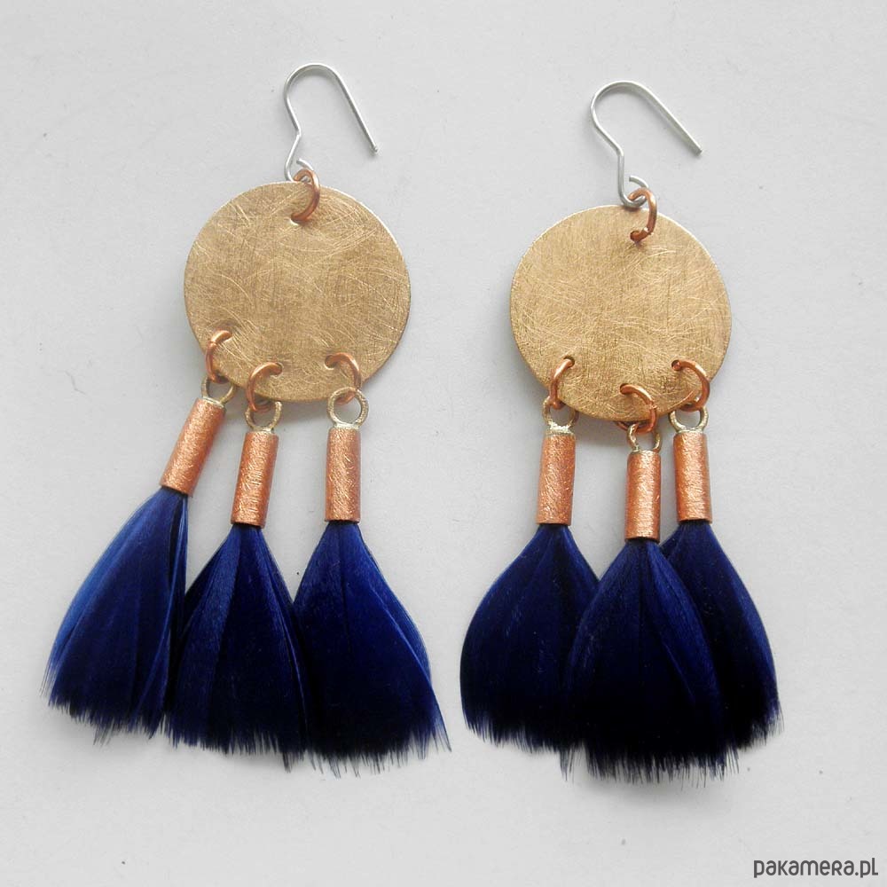 PIÓRKO - stylowy dodatek. Połączenie lekkości piórka i trwałości metalu. Metal niezwykle kontrastuje z naturalnym barwionym puchem. Kolczyki wykonane są z srebro, miedź, brąz. naturalnie barwione pióra. Srebro, miedź, brąz - zmatowiony. Bigle otwarte - srebro pr.925. Długość z biglami - 10 cm. Szerokość - 5 cm.