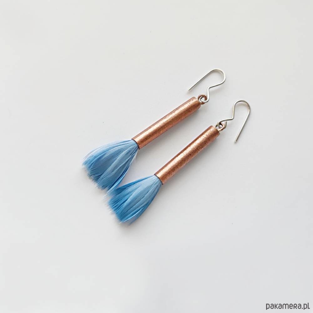 PIÓRKO - stylowy dodatek. Połączenie lekkości piórka i trwałości metalu. Metal niezwykle kontrastuje z naturalnym barwionym puchem. Kolczyki wykonane są z miedzi, naturalnie barwione pióra. Miedź - zmatowiony. Bigle otwarte - srebro pr.925. Długość z biglami - 5 cm.