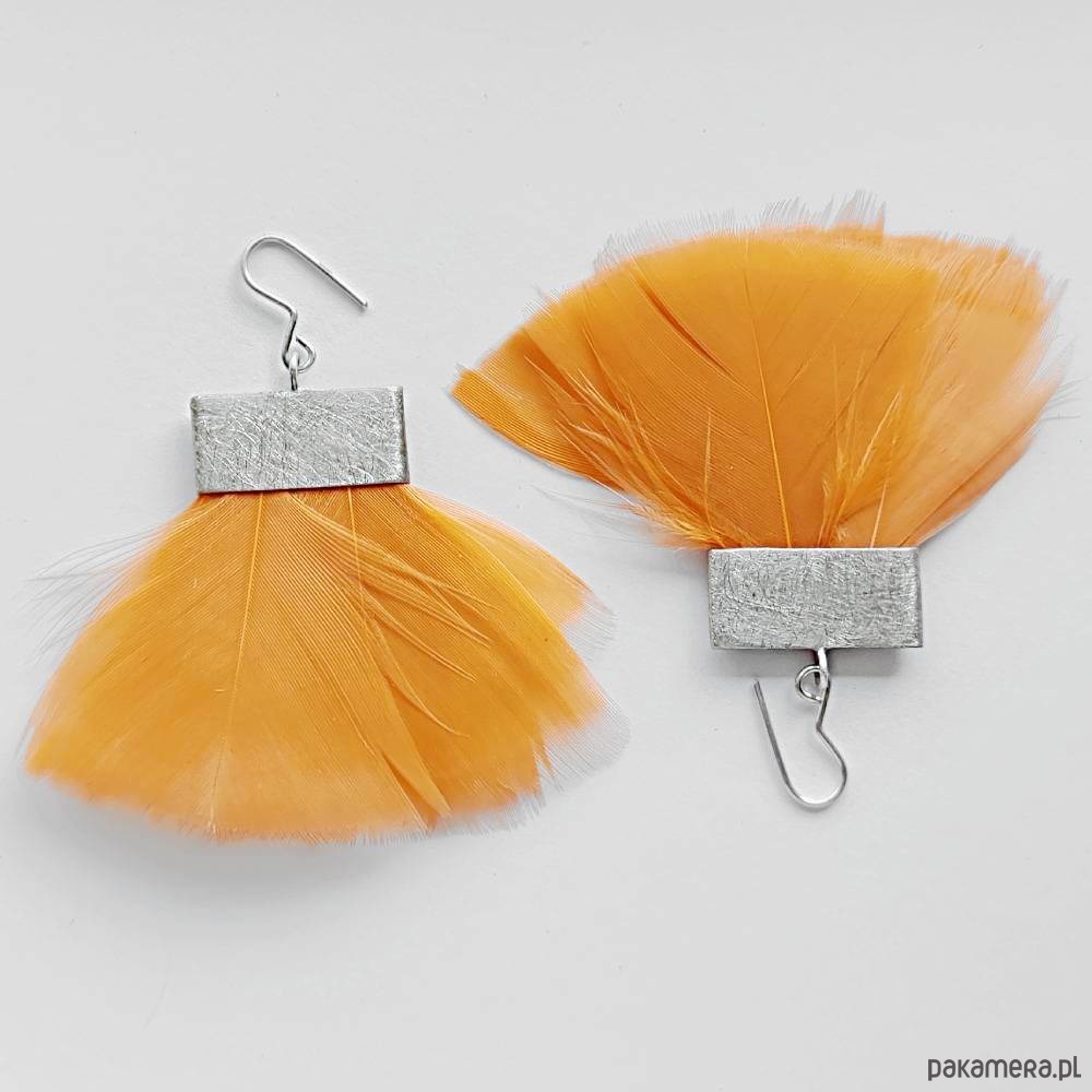 PIÓRKO - stylowy dodatek. Połączenie lekkości piórka i trwałości metalu. Metal niezwykle kontrastuje z naturalnym barwionym puchem. Kolczyki wykonane są z alpaka, naturalnie barwione pióra.Alpaka - zmatowiona. Bigle otwarte - srebro pr.925. Długość z biglami - 7 cm. Szerokość - 7 cm.