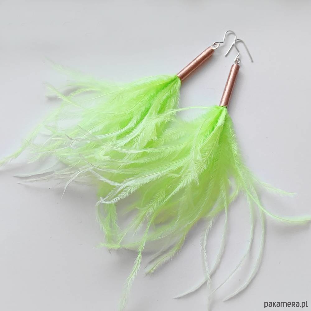 PIÓRKO - stylowy dodatek. Połączenie lekkości piórka i trwałości metalu. Metal niezwykle kontrastuje z naturalnym barwionym puchem. Kolczyki wykonane są z miedzi, naturalnie barwione pióra. Miedź - zmatowiony. Bigle otwarte - srebro pr.925. Długość z biglami - 15 cm.