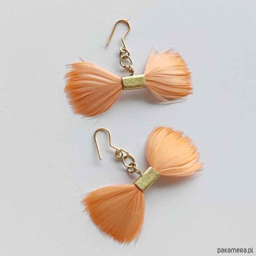 PIÓRKO - stylowy dodatek. Połączenie lekkości piórka i trwałości metalu. Metal niezwykle kontrastuje z naturalnym barwionym puchem. Kolczyki wykonane są z mosiądz, naturalnie barwione pióra. Mosiądz - zmatowiony. Bigle otwarte - srebro pr.925 pozłacane. Długość z biglami - 4,5 cm, szerokość - 5,5 cm