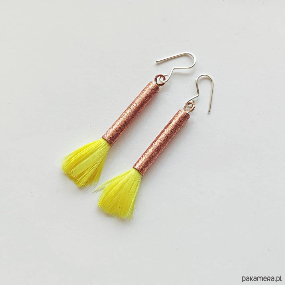 PIÓRKO - stylowy dodatek. Połączenie lekkości piórka i trwałości metalu. Metal niezwykle kontrastuje z naturalnym barwionym puchem. Kolczyki wykonane są z miedzi, naturalnie barwione pióra. Miedź - zmatowiony. Bigle otwarte - srebro pr.925. Długość z biglami - 5 cm.