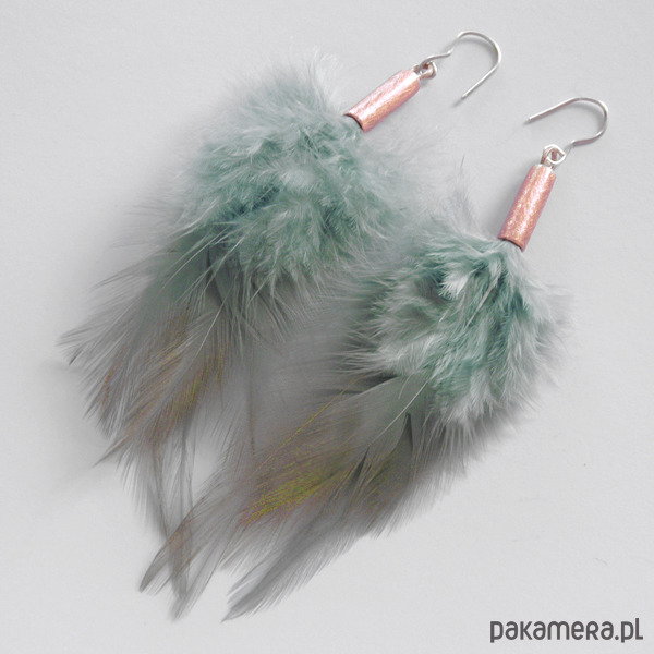 PIÓRKO - stylowy dodatek. Połączenie lekkości piórka i trwałości metalu. Metal niezwykle kontrastuje z naturalnym barwionym puchem. Kolczyki wykonane są z : miedź, naturalne barwione pióra. Miedź : zmatowiona. Bigle otwarte - srebro pr.925. Długość z biglami - 11 cm.