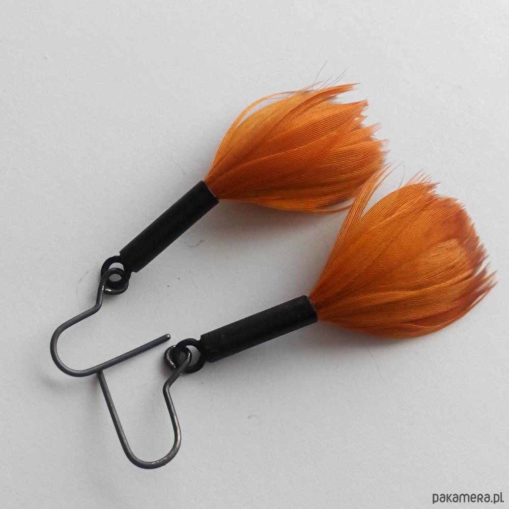 PIÓRKO - stylowy dodatek. Połączenie lekkości piórka i trwałości metalu. Metal niezwykle kontrastuje z naturalnym barwionym puchem. Kolczyki wykonane są z mosiądzu, naturalnie barwione pióra. Mosiądz - oksydowan. Bigle otwarte - srebro pr.925,oksydowane. Długość z biglami - ok. 5,5 cm. Szerokość - 2 cm. Waga - ok. 2,3 g.