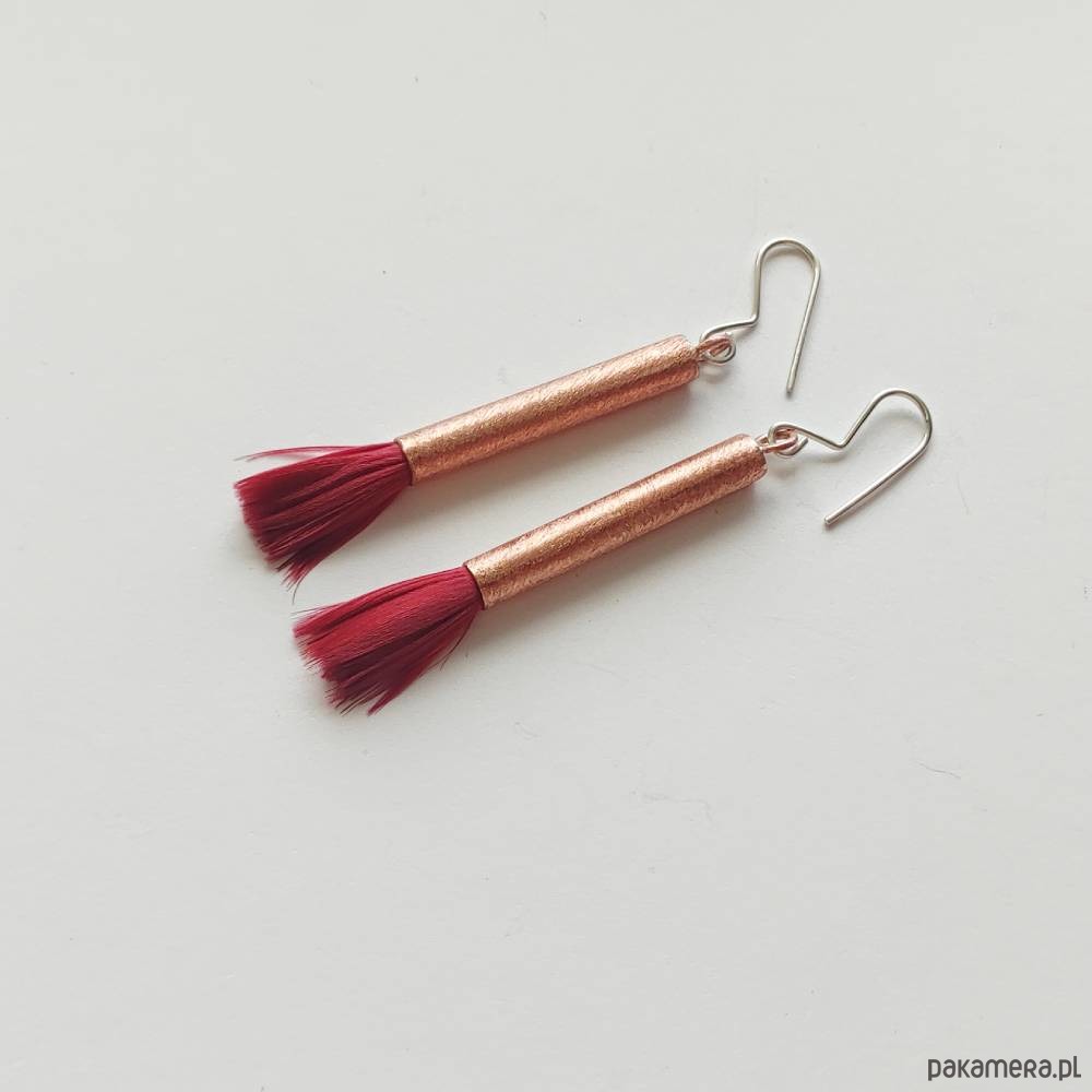 PIÓRKO - stylowy dodatek. Połączenie lekkości piórka i trwałości metalu. Metal niezwykle kontrastuje z naturalnym barwionym puchem. Kolczyki wykonane są z miedzi, naturalnie barwione pióra. Miedź - zmatowiony. Bigle otwarte - srebro pr.925. Długość z biglami - 5 cm.