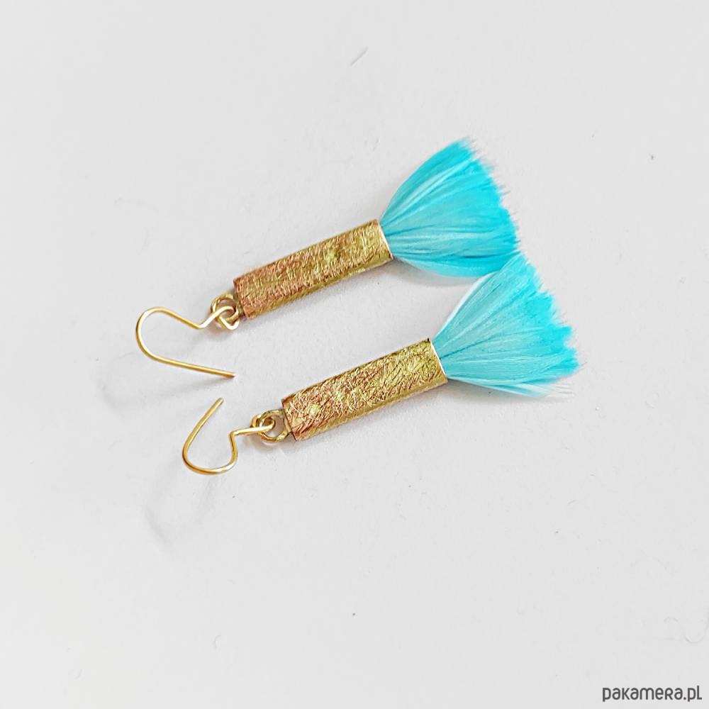 PIÓRKO - stylowy dodatek. Połączenie lekkości piórka i trwałości metalu. Metal niezwykle kontrastuje z naturalnym barwionym puchem. Kolczyki wykonane są z miedzi, naturalnie barwione pióra. Miedź - zmatowiony. Bigle otwarte - srebro pr.925. Długość z biglami - 5,5 cm. Szerokość - 1,5 cm. Waga - ok. 2,5 g.