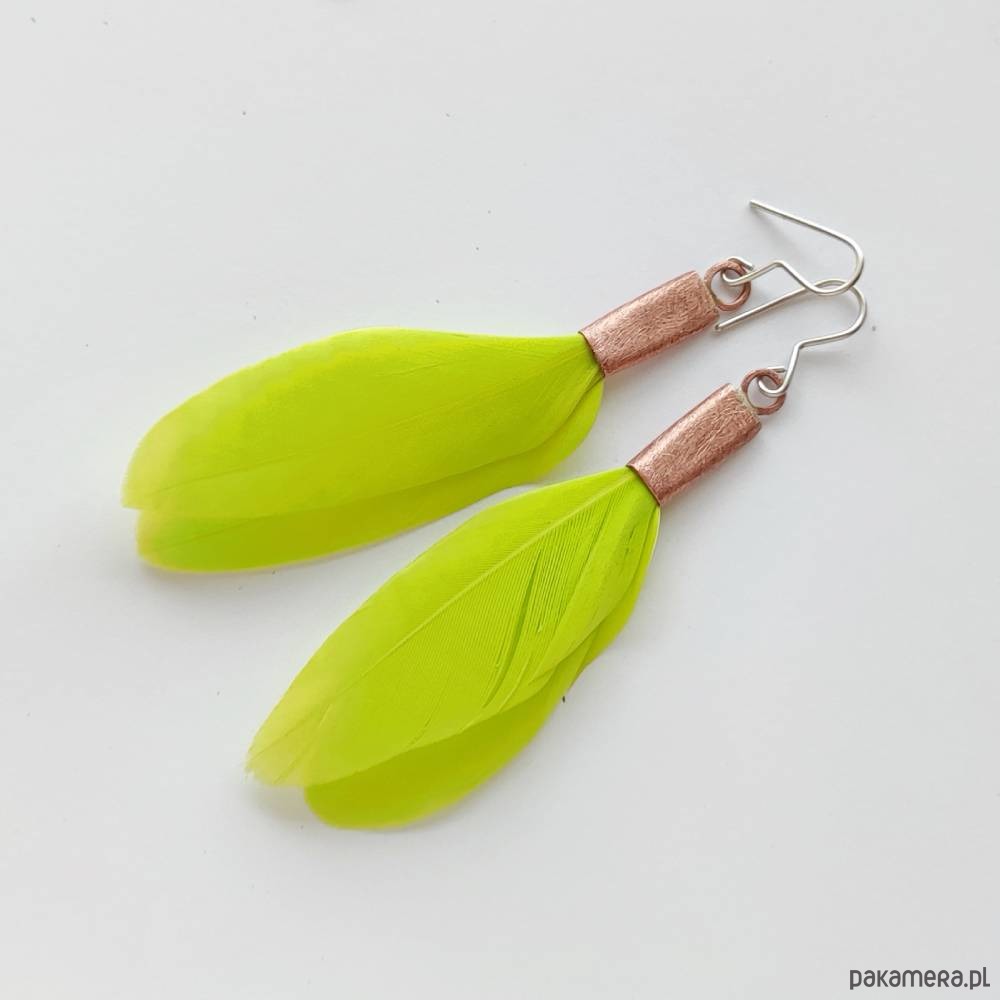 PIÓRKO - stylowy dodatek. Połączenie lekkości piórka i trwałości metalu. Metal niezwykle kontrastuje z naturalnym barwionym puchem. Kolczyki wykonane są z miedzi, naturalnie barwione pióra. Miedź - zmatowiony. Bigle otwarte - srebro pr.925. Długość z biglami - 8 cm. Szerokość 3 cm