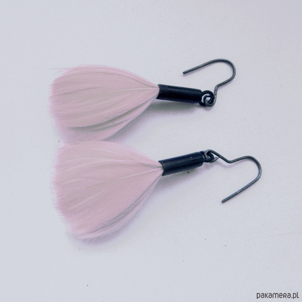 PIÓRKO - stylowy dodatek. Połączenie lekkości piórka i trwałości metalu. Metal niezwykle kontrastuje z naturalnym barwionym puchem. Kolczyki wykonane są z mosiądzu, naturalnie barwione pióra. Mosiądz - oksydowan. Bigle otwarte - srebro pr.925,oksydowane. Długość z biglami - ok. 5,5 cm. Szerokość - 2 cm. Waga - ok. 2,3 g.