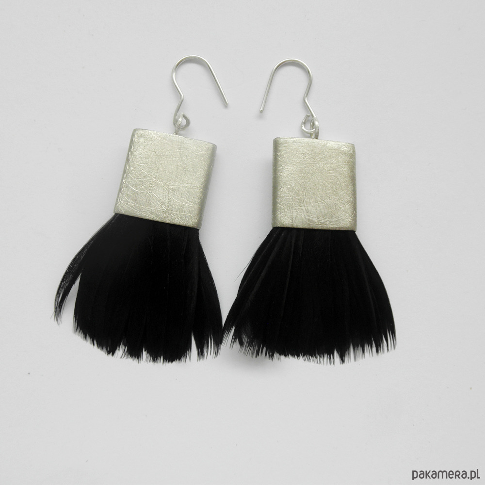 PIÓRKO – stylowy dodatek. Połączenie lekkości piórka i trwałości metalu. Metal niezwykle kontrastuje z naturalnym barwionym puchem. Kolczyki wykonane są z alpaka, naturalnie barwione pióra. Alpaka – zmatowiona. Bigle otwarte – srebro pr.925. Długość z biglami – 6,5 cm. Szerokość – 3 cm.