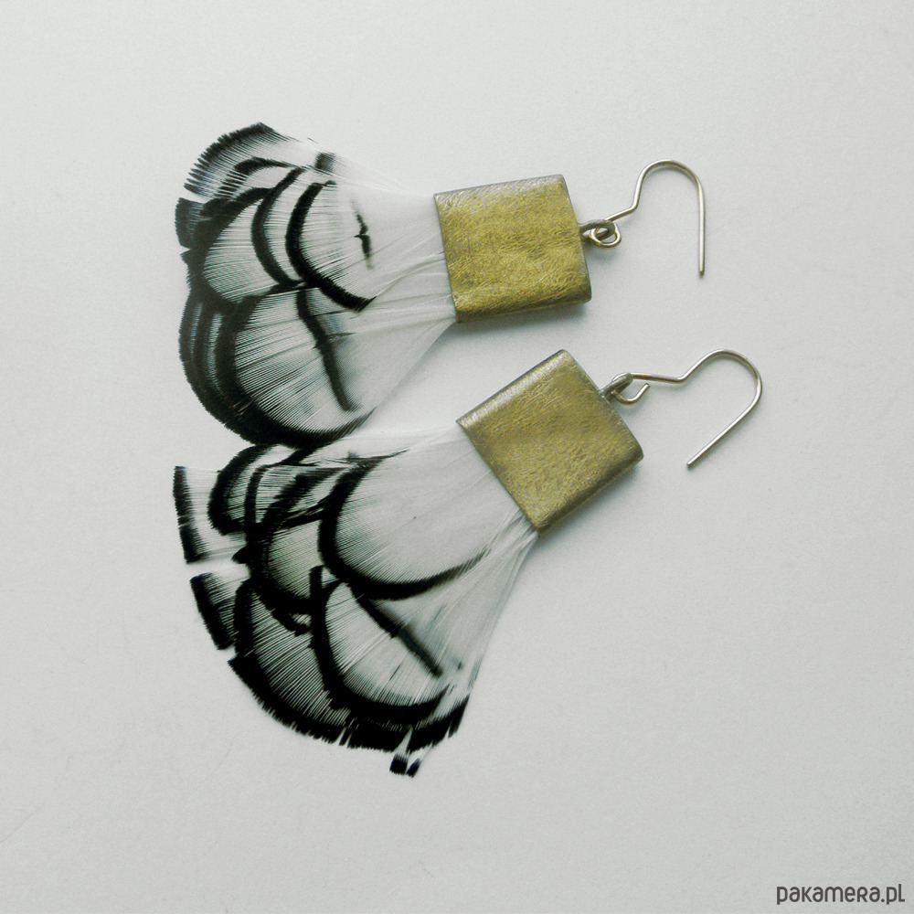 PIÓRKO - stylowy dodatek. Połączenie lekkości piórka i trwałości metalu. Metal niezwykle kontrastuje z naturalnym barwionym puchem. Kolczyki wykonane są z mosiądzu, naturalnie barwione pióra. Mosiądz - zmatowiony. Bigle otwarte - srebro pr.925, pozłacane. Długość z biglami -7,5 cm. Szerokość - 3,5 cm.
