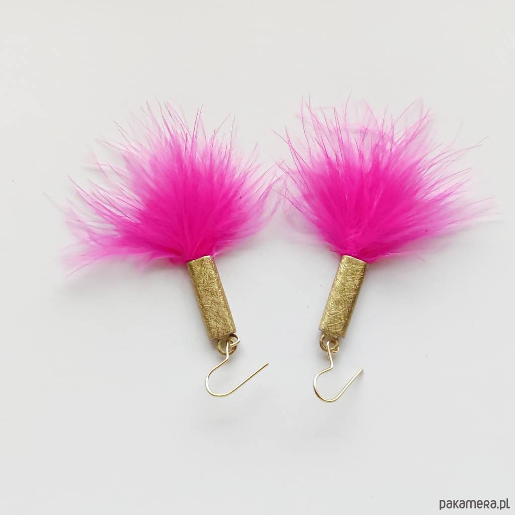 PIÓRKO - stylowy dodatek. Połączenie lekkości piórka i trwałości metalu. Metal niezwykle kontrastuje z naturalnym barwionym puchem. Kolczyki wykonane są z mosiądzu, naturalnie barwione pióra. Mosiądz - zmatowiony. Bigle otwarte - srebro pr.925 pozłacane. Długość z biglami - ok. 5,5 cm. Szerokość - 2 cm. Waga - ok. 2,3 g.