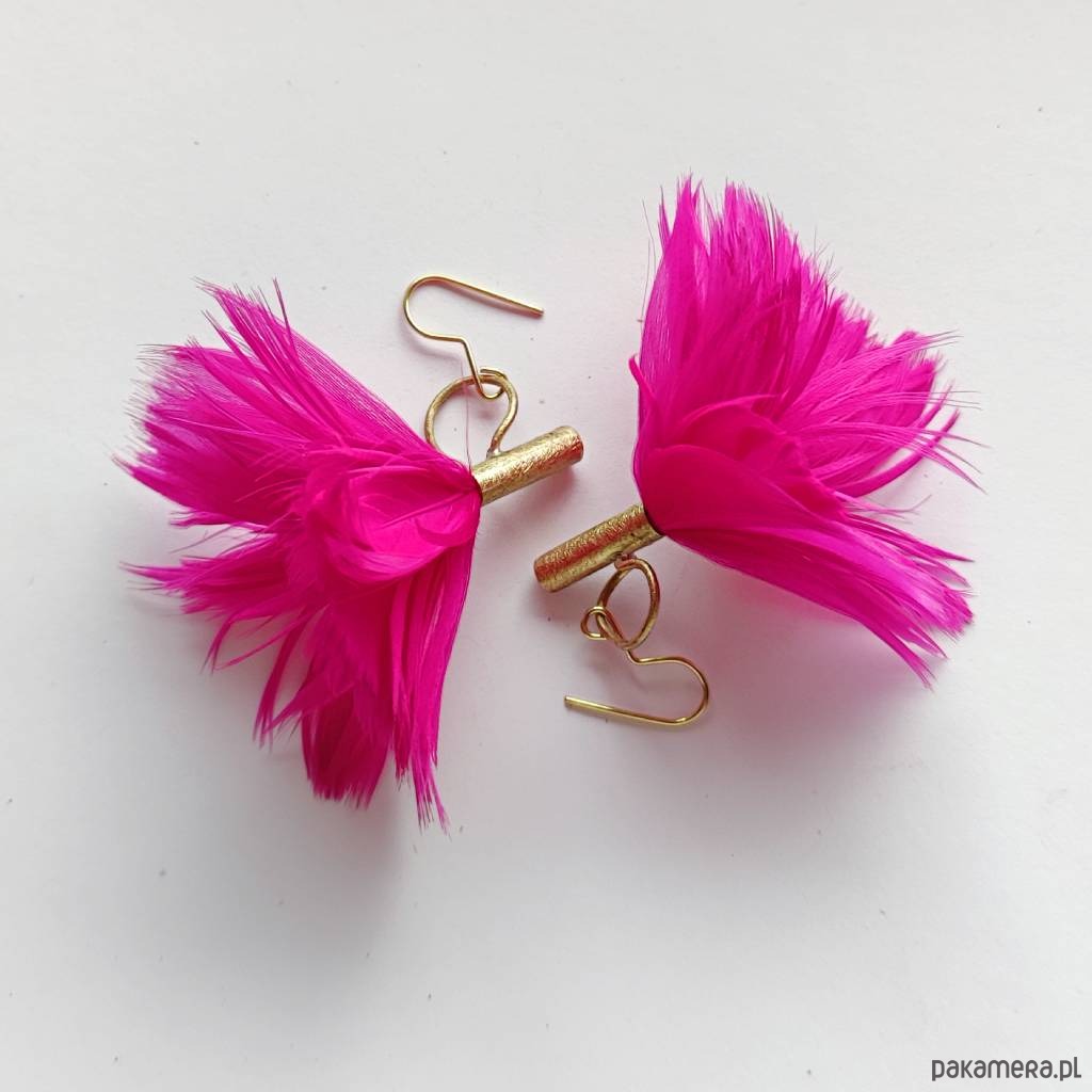 PIÓRKO - stylowy dodatek. Połączenie lekkości piórka i trwałości metalu. Metal niezwykle kontrastuje z naturalnym barwionym puchem. Kolczyki wykonane są z mosiądzu, naturalnie barwione pióra. Mosiądz - zmatowiony. Bigle otwarte - srebro pr.925,pozłacane. Długość z biglami ok. 6 cm. Szerokość - 6cm. .