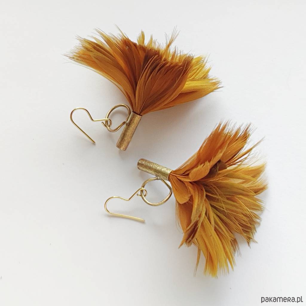 PIÓRKO - stylowy dodatek. Połączenie lekkości piórka i trwałości metalu. Metal niezwykle kontrastuje z naturalnym barwionym puchem. Kolczyki wykonane są z mosiądzu, naturalnie barwione pióra. Mosiądz - zmatowiony. Bigle otwarte - srebro pr.925,pozłacane. Długość z biglami ok. 6 cm. Szerokość - 6cm. .