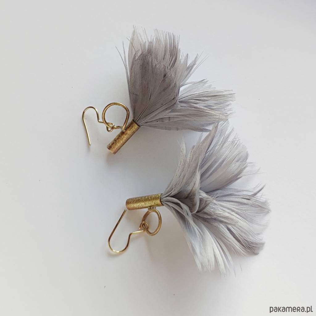 PIÓRKO - stylowy dodatek. Połączenie lekkości piórka i trwałości metalu. Metal niezwykle kontrastuje z naturalnym barwionym puchem. Kolczyki wykonane są z mosiądzu, naturalnie barwione pióra. Mosiądz - zmatowiony. Bigle otwarte - srebro pr.925,pozłacane. Długość z biglami ok. 6 cm. Szerokość - 6cm. .