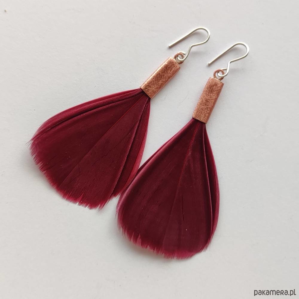 PIÓRKO - stylowy dodatek. Połączenie lekkości piórka i trwałości metalu. Metal niezwykle kontrastuje z naturalnym barwionym puchem. Kolczyki wykonane są z : miedź, naturalne barwione pióra. Miedź : zmatowiona. Bigle otwarte - srebro pr.925. Długość z biglami - 9 cm. Szerokość ok. 4 cm.