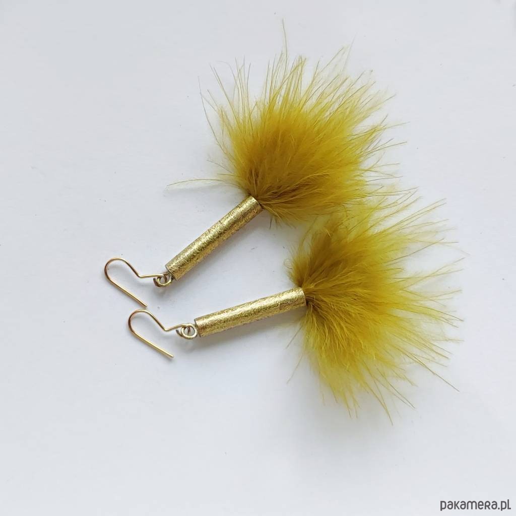 PIÓRKO - stylowy dodatek. Połączenie lekkości piórka i trwałości metalu. Metal niezwykle kontrastuje z naturalnym barwionym puchem. Kolczyki wykonane są z miedzi, naturalnie barwione pióra. Miedź - zmatowiony. Bigle otwarte - srebro pr.925. Długość z biglami - 7,5 cm.