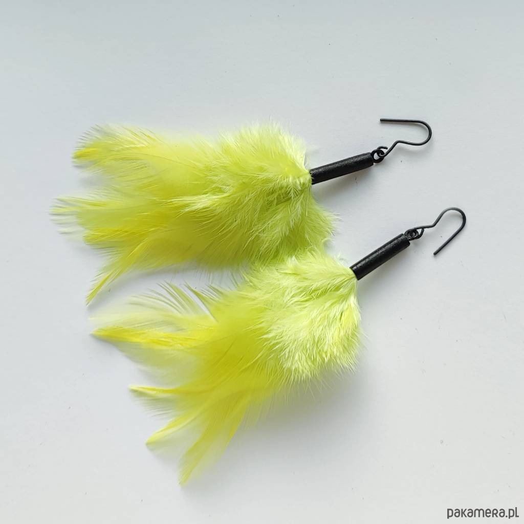 PIÓRKO - stylowy dodatek. Połączenie lekkości piórka i trwałości metalu. Metal niezwykle kontrastuje z naturalnym barwionym puchem. Kolczyki wykonane są z : mosiądz, naturalne barwione pióra. Mosiądz : oksydowany. Bigle otwarte - srebro pr.925,oksydowane. Długość z biglami - 9 cm.