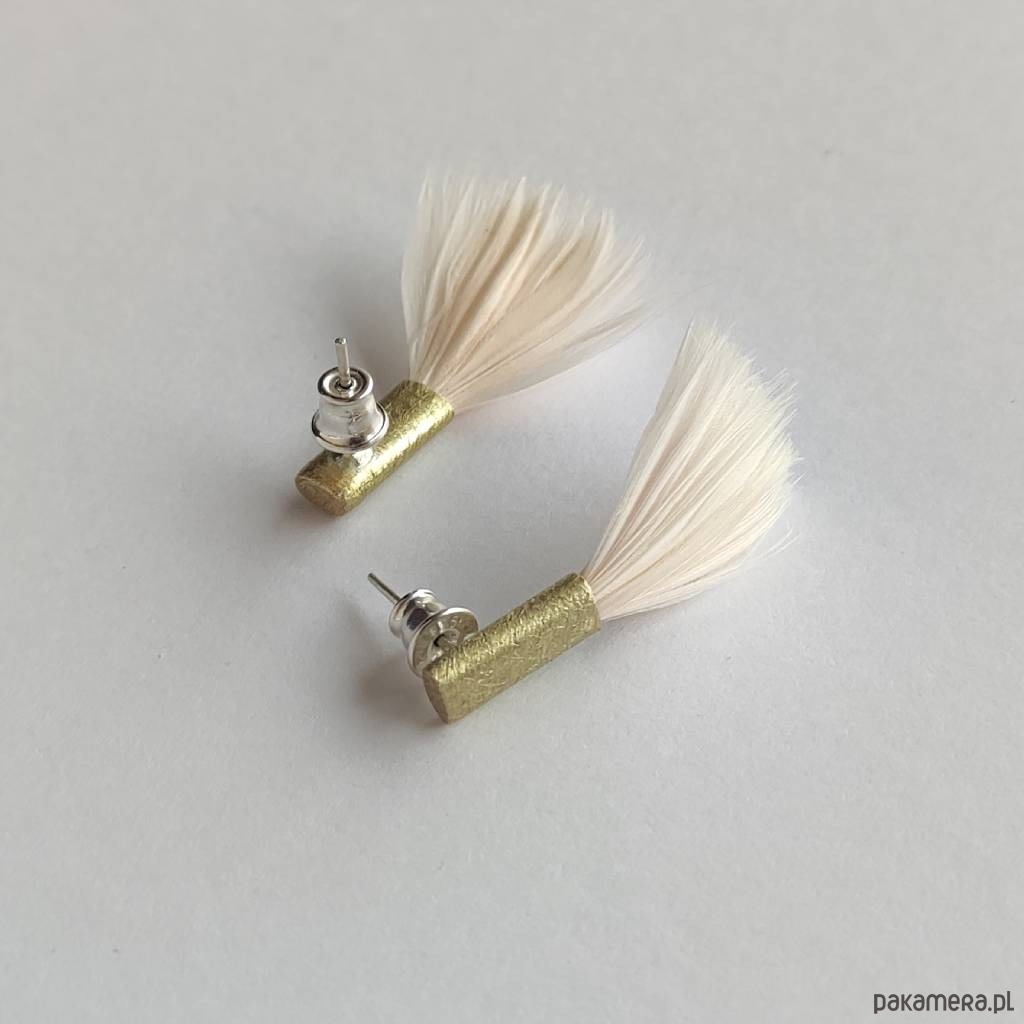 PIÓRKO - stylowy dodatek. Połączenie lekkości piórka i trwałości metalu. Metal niezwykle kontrastuje z naturalnym barwionym puchem.Kolczyki na sztyftach. Kolczyki wykonane są z :mosiądz,srebro- próby 0,925, naturalnie barwione pióra. Mosiądz - zmatowiony. Długość - ok. 3,5cm. Szerokość - 2 cm. Waga - ok. 2 g.