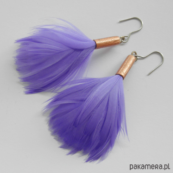PIÓRKO - stylowy dodatek. Połączenie lekkości piórka i trwałości metalu. Metal niezwykle kontrastuje z naturalnym barwionym puchem. Kolczyki wykonane są z miedzi, naturalnie barwione pióra. Miedź - zmatowiony. Bigle otwarte - srebro pr.925. Długość z biglami - 8,5 cm. Szerokość - 4 cm. Waga - ok. 2,5 g.