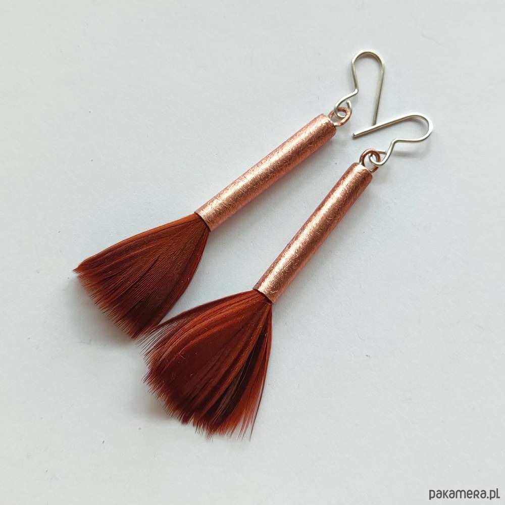 PIÓRKO - stylowy dodatek. Połączenie lekkości piórka i trwałości metalu. Metal niezwykle kontrastuje z naturalnym barwionym puchem. Kolczyki wykonane są z miedzi, naturalnie barwione pióra. Miedź - zmatowiony. Bigle otwarte - srebro pr.925. Długość z biglami - 5 cm.