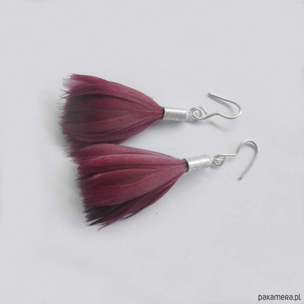 PIÓRKO - stylowy dodatek. Połączenie lekkości piórka i trwałości metalu. Metal niezwykle kontrastuje z naturalnym barwionym puchem. Kolczyki wykonane są z srebro, naturalnie barwione pióra. Srebro - zmatowione. Bigle otwarte - srebro pr.925. Długość z biglami - 5,5 cm.