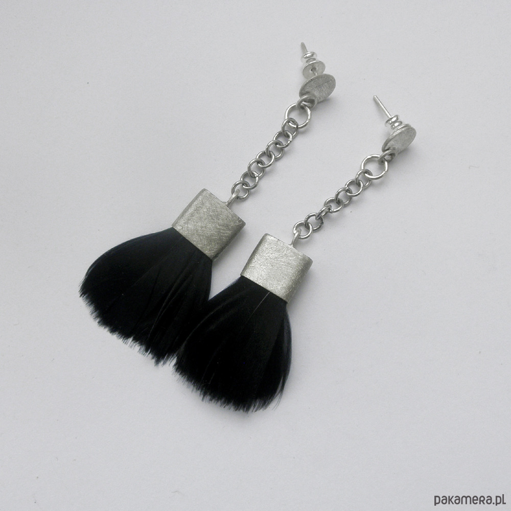 PIÓRKO - stylowy dodatek. Połączenie lekkości piórka i trwałości metalu. Metal niezwykle kontrastuje z naturalnym barwionym puchem. Kolczyki wykonane są z alpaka, naturalnie barwione pióra. Alpaka - zmatowiona. Bigle otwarte - srebro pr.925. Długość z biglami - 6,5 cm. Szerokość - ok. 2 cm.