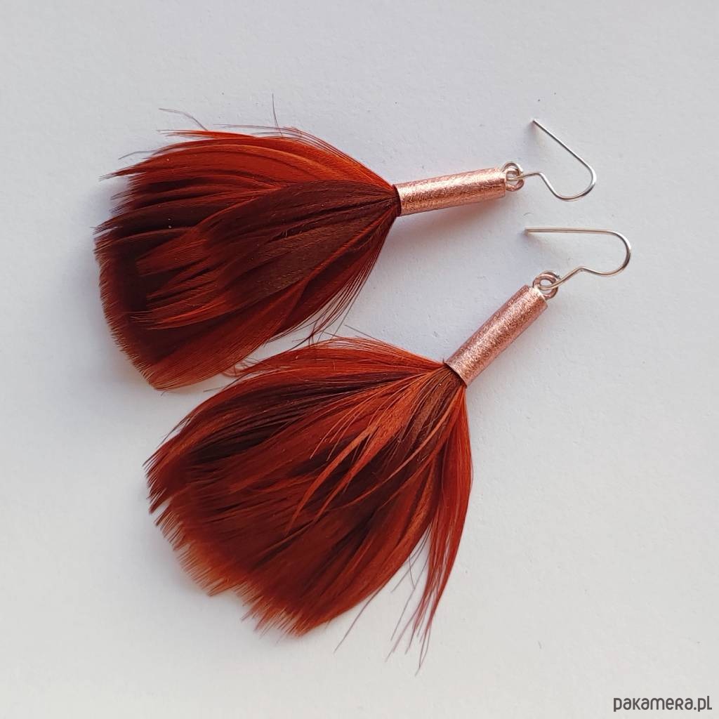 PIÓRKO - stylowy dodatek. Połączenie lekkości piórka i trwałości metalu. Metal niezwykle kontrastuje z naturalnym barwionym puchem. Kolczyki wykonane są z miedzi, naturalnie barwione pióra. Miedź - zmatowiony. Bigle otwarte - srebro pr.925. Długość z biglami - 8,5 cm. Szerokość - 4 cm. Waga - ok. 2,5 g.