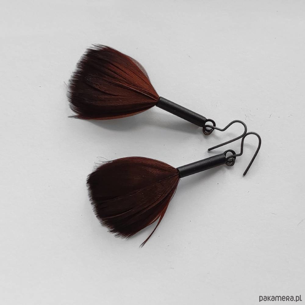 PIÓRKO - stylowy dodatek. Połączenie lekkości piórka i trwałości metalu. Metal niezwykle kontrastuje z naturalnym barwionym puchem. Kolczyki wykonane są z mosiądzu, naturalnie barwione pióra. Mosiądz - zmatowiony, oksydowane. Bigle otwarte - srebro pr.925,oksydowane, Długość z biglami - ok. 5,5 cm. Szerokość - 2 cm. Waga - ok. 2,3 g.