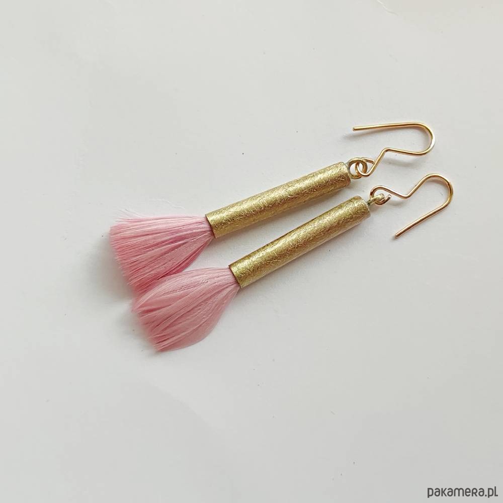 PIÓRKO - stylowy dodatek. Połączenie lekkości piórka i trwałości metalu. Metal niezwykle kontrastuje z naturalnym barwionym puchem. Kolczyki wykonane są z mosiądz, naturalnie barwione pióra. Mosiądz - zmatowiony. Bigle otwarte - srebro pr.925 pozłacane. Długość z biglami - 5 cm.
