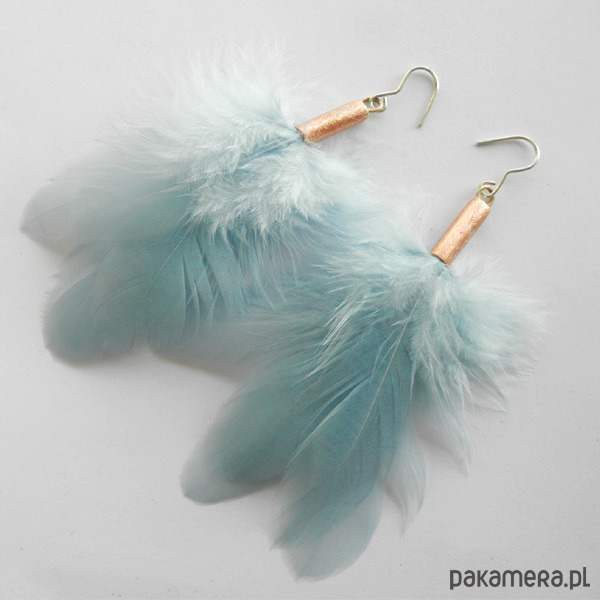 PIÓRKO - stylowy dodatek. Połączenie lekkości piórka i trwałości metalu. Metal niezwykle kontrastuje z naturalnym barwionym puchem. Kolczyki wykonane są z : miedź, naturalne barwione pióra. Miedź : zmatowiona. Bigle otwarte - srebro pr.925. Długość z biglami - 10 cm. Szerokość ok. 5 cm.
