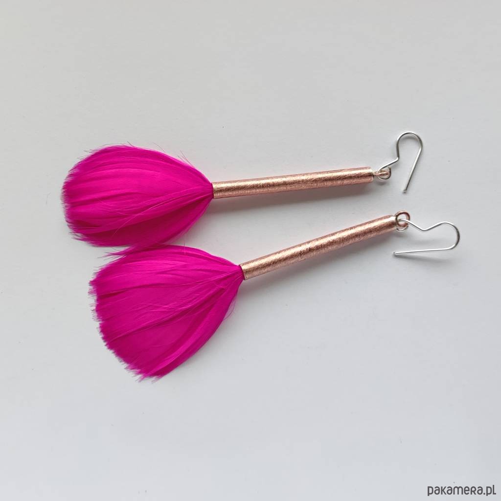 PIÓRKO - stylowy dodatek. Połączenie lekkości piórka i trwałości metalu. Metal niezwykle kontrastuje z naturalnym barwionym puchem. Kolczyki wykonane są z : miedź, naturalne barwione pióra. Miedź : zmatowiona. Bigle otwarte - srebro pr.925. Długość z biglami -8 cm.
