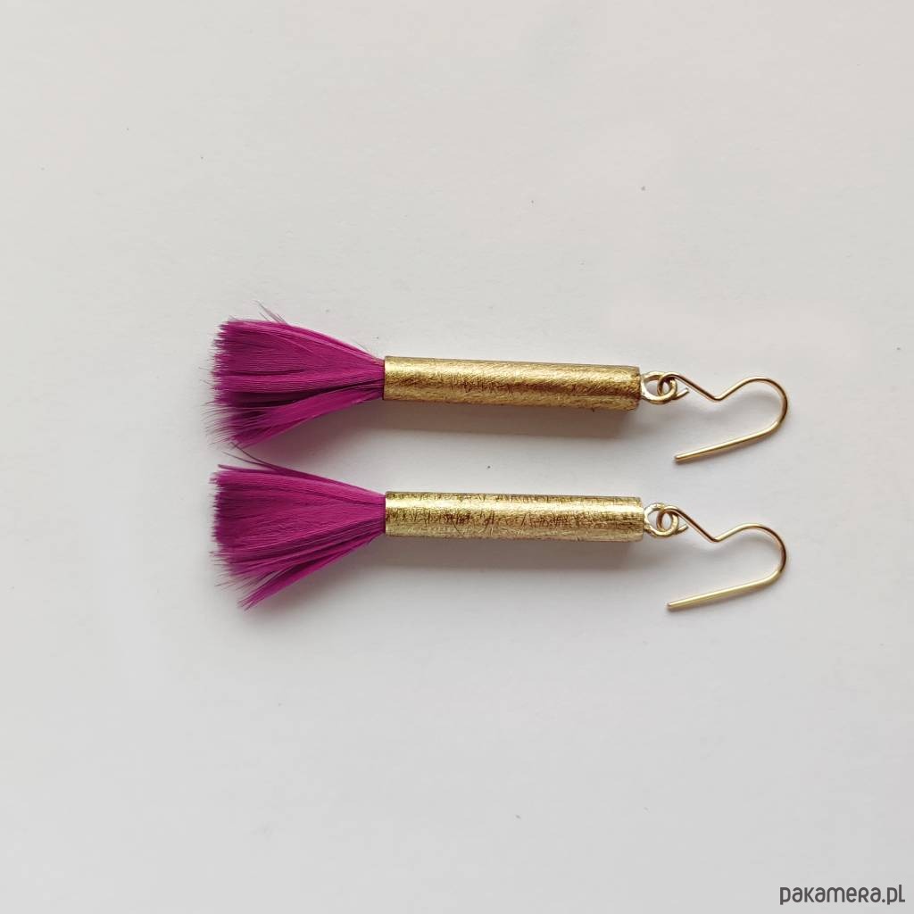 PIÓRKO - stylowy dodatek. Połączenie lekkości piórka i trwałości metalu. Metal niezwykle kontrastuje z naturalnym barwionym puchem. Kolczyki wykonane są z miedzi, naturalnie barwione pióra. Miedź - zmatowiony. Bigle otwarte - srebro pr.925. Długość z biglami - 5 cm.