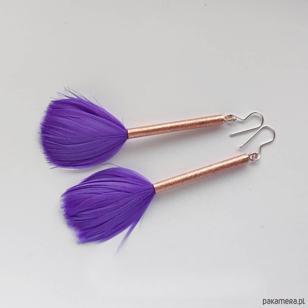 PIÓRKO - stylowy dodatek. Połączenie lekkości piórka i trwałości metalu. Metal niezwykle kontrastuje z naturalnym barwionym puchem. Kolczyki wykonane są z : miedź, naturalne barwione pióra. Miedź : zmatowiona. Bigle otwarte - srebro pr.925. Długość z biglami -8 cm.