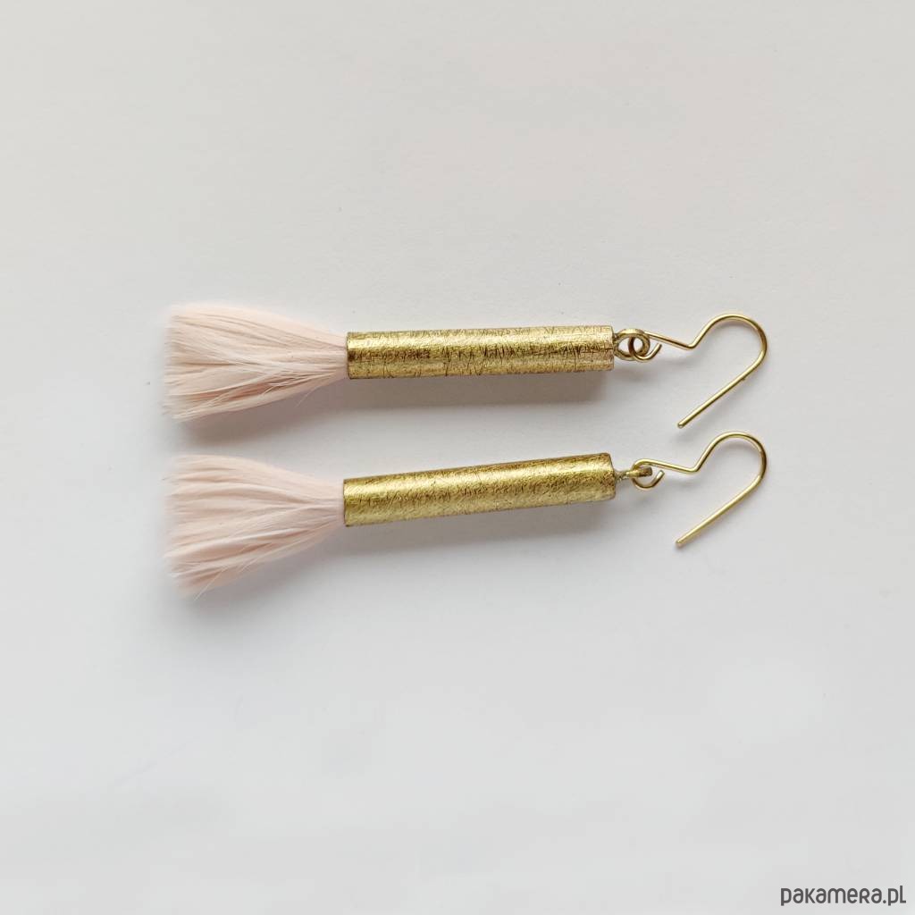 PIÓRKO - stylowy dodatek. Połączenie lekkości piórka i trwałości metalu. Metal niezwykle kontrastuje z naturalnym barwionym puchem. Kolczyki wykonane są z miedzi, naturalnie barwione pióra. Miedź - zmatowiony. Bigle otwarte - srebro pr.925. Długość z biglami - 5 cm.