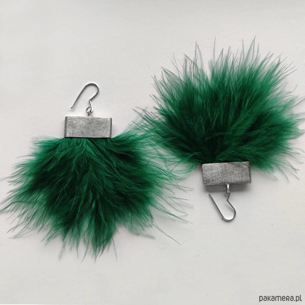 PIÓRKO - stylowy dodatek. Połączenie lekkości piórka i trwałości metalu. Metal niezwykle kontrastuje z naturalnym barwionym puchem. Kolczyki wykonane są z alpaka, naturalnie barwione pióra.Alpaka - zmatowiona. Bigle otwarte - srebro pr.925. Długość z biglami - 7 cm. Szerokość - 7 cm.