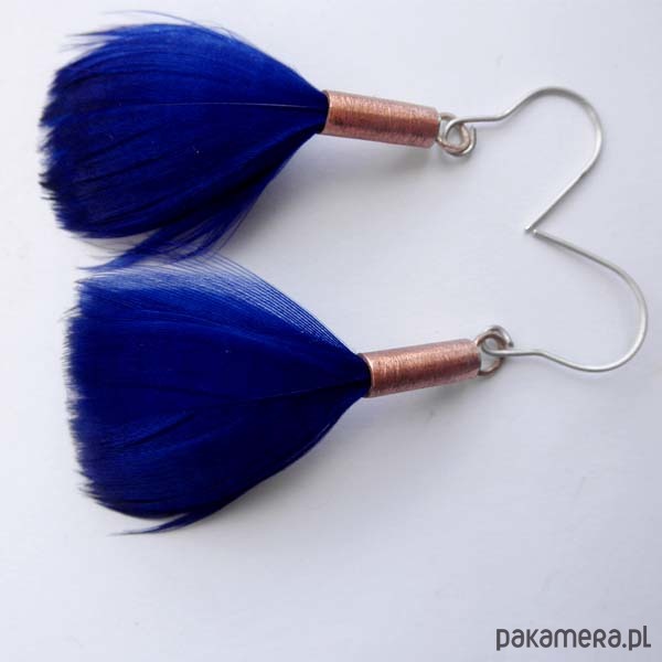 PIÓRKO - stylowy dodatek. Połączenie lekkości piórka i trwałości metalu. Metal niezwykle kontrastuje z naturalnym barwionym puchem. Kolczyki wykonane są z : miedź, naturalne barwione pióra. Miedź : zmatowiona. Bigle otwarte - srebro pr.925. Długość z biglami - 8 cm. Waga: ok. 3 g