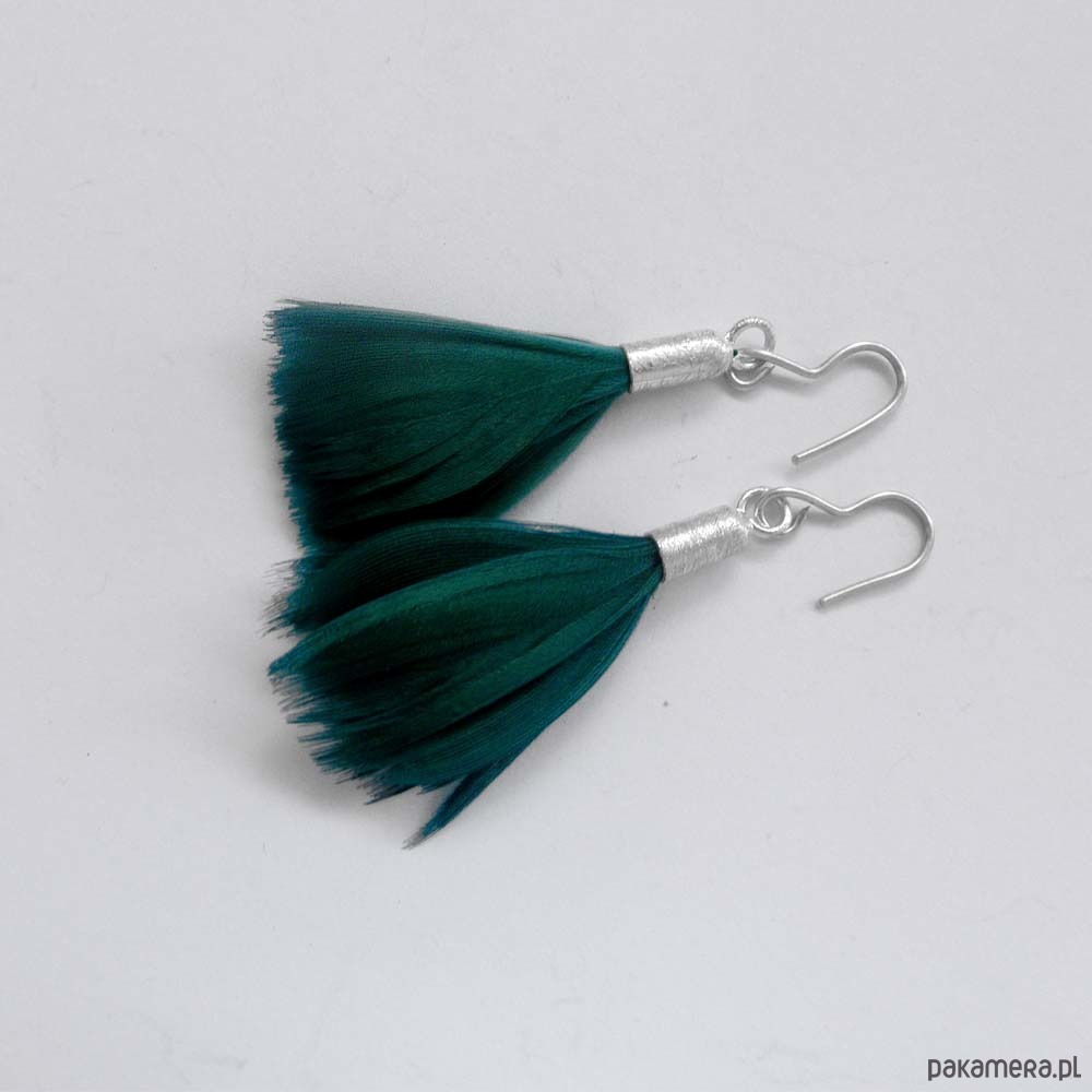 PIÓRKO - stylowy dodatek. Połączenie lekkości piórka i trwałości metalu. Metal niezwykle kontrastuje z naturalnym barwionym puchem. Kolczyki wykonane są z srebro, naturalnie barwione pióra. Srebro - zmatowione. Bigle otwarte - srebro pr.925. Długość z biglami - 5,5 cm.