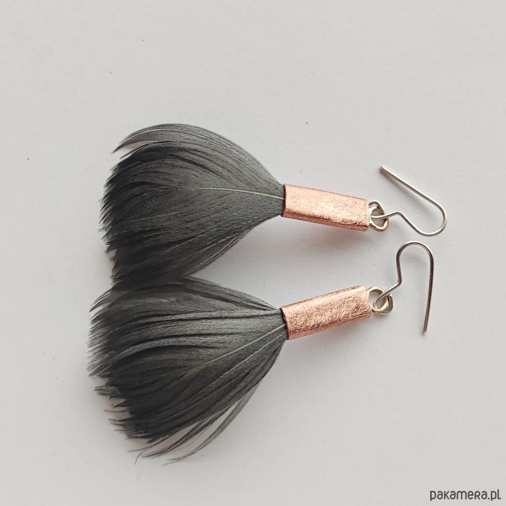 PIÓRKO - stylowy dodatek. Połączenie lekkości piórka i trwałości metalu. Metal niezwykle kontrastuje z naturalnym barwionym puchem. Kolczyki wykonane są z miedzi, naturalnie barwione pióra. Miedź - zmatowiony. Bigle otwarte - srebro pr.925. Długość z biglami - 7,5 cm. Szerokość - 3 cm. Waga - ok. 2,5 g.