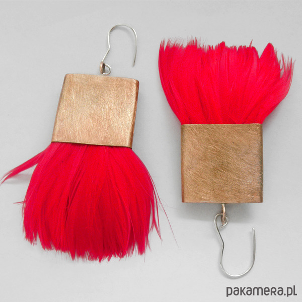 PIÓRKO - stylowy dodatek. Połączenie lekkości piórka i trwałości metalu. Metal niezwykle kontrastuje z naturalnym barwionym puchem. Kolczyki wykonane są z brązu, naturalnie barwione pióra. Brąz - zmatowiony. Bigle otwarte - srebro pr.925. Długość z biglami - 8 cm. Szerokość - 5 cm.